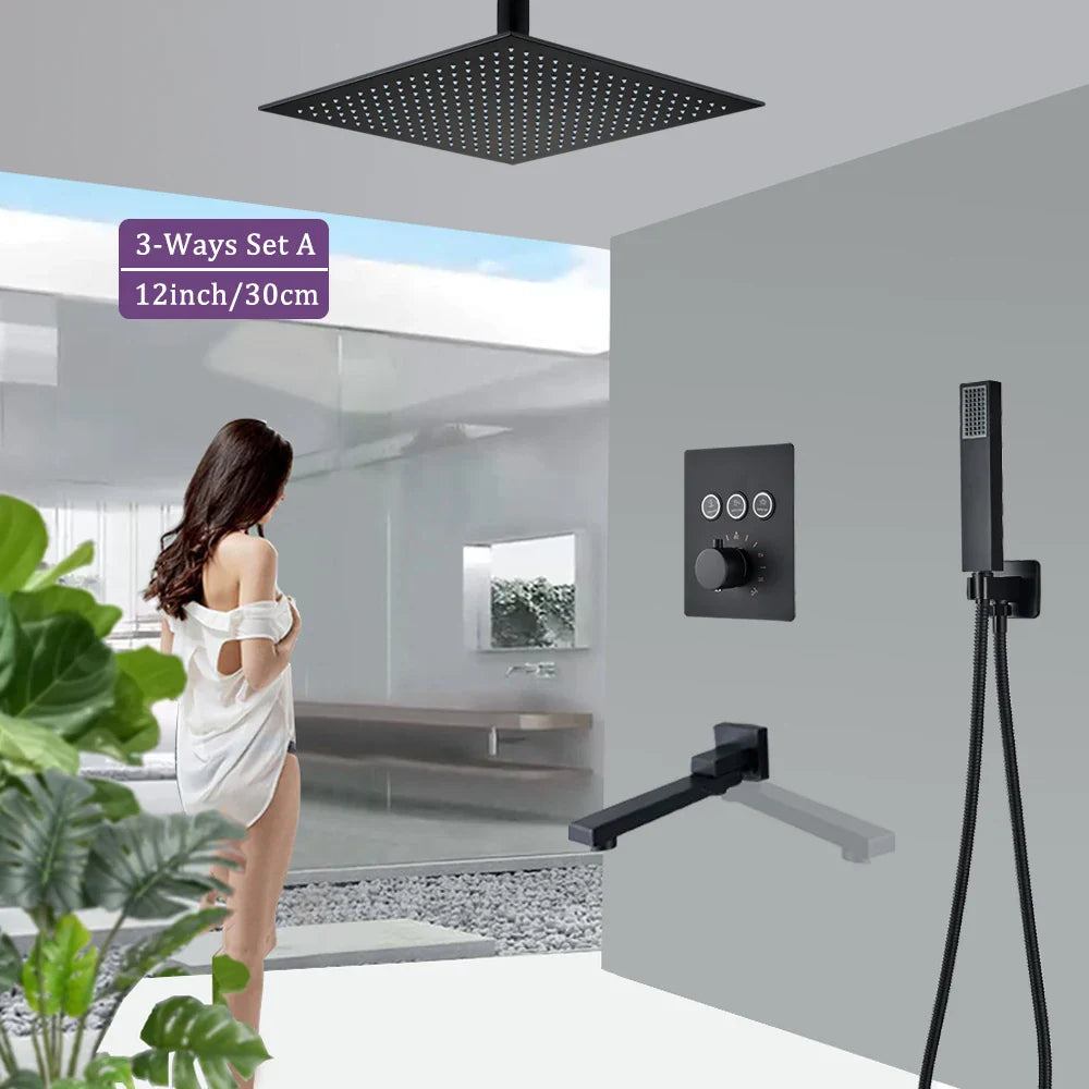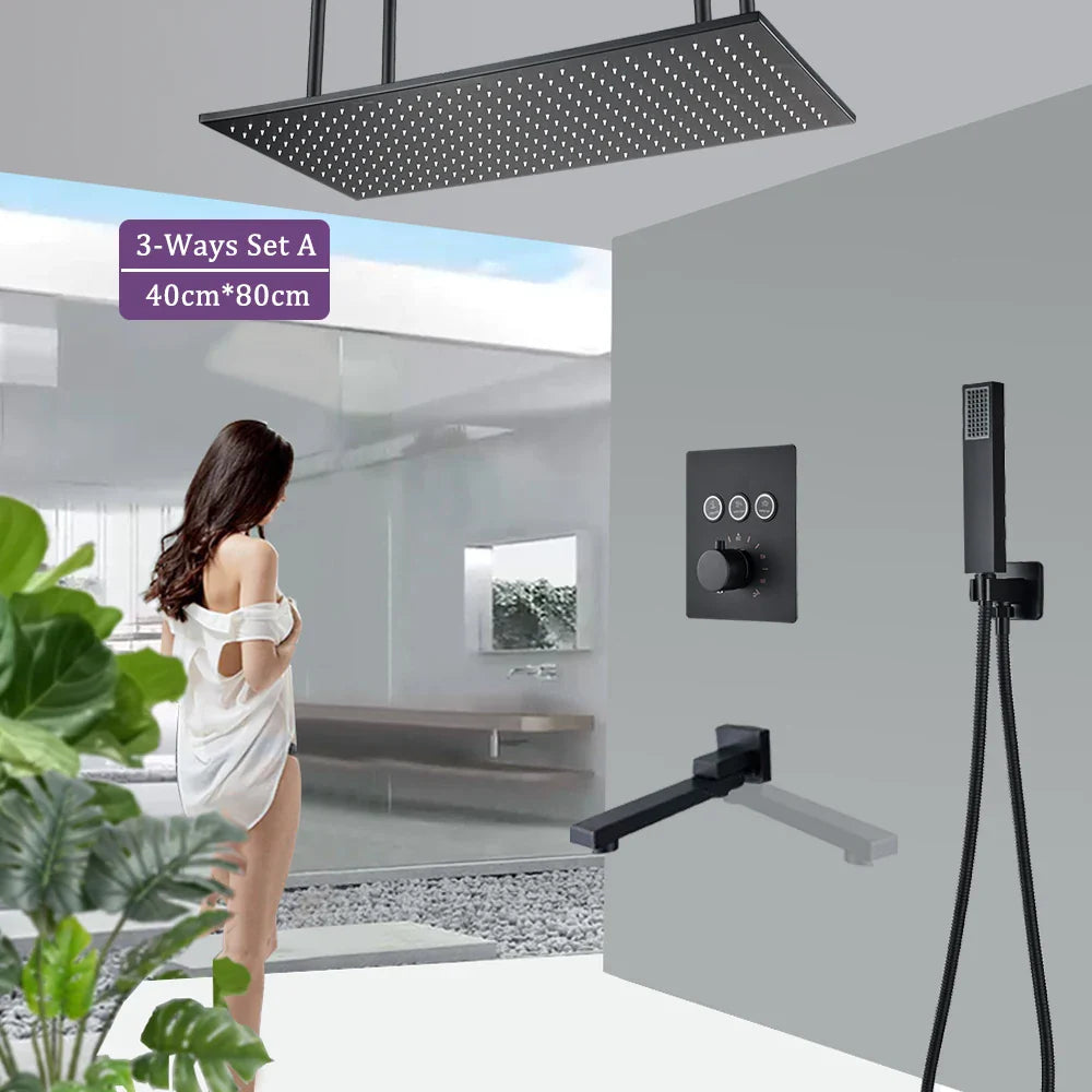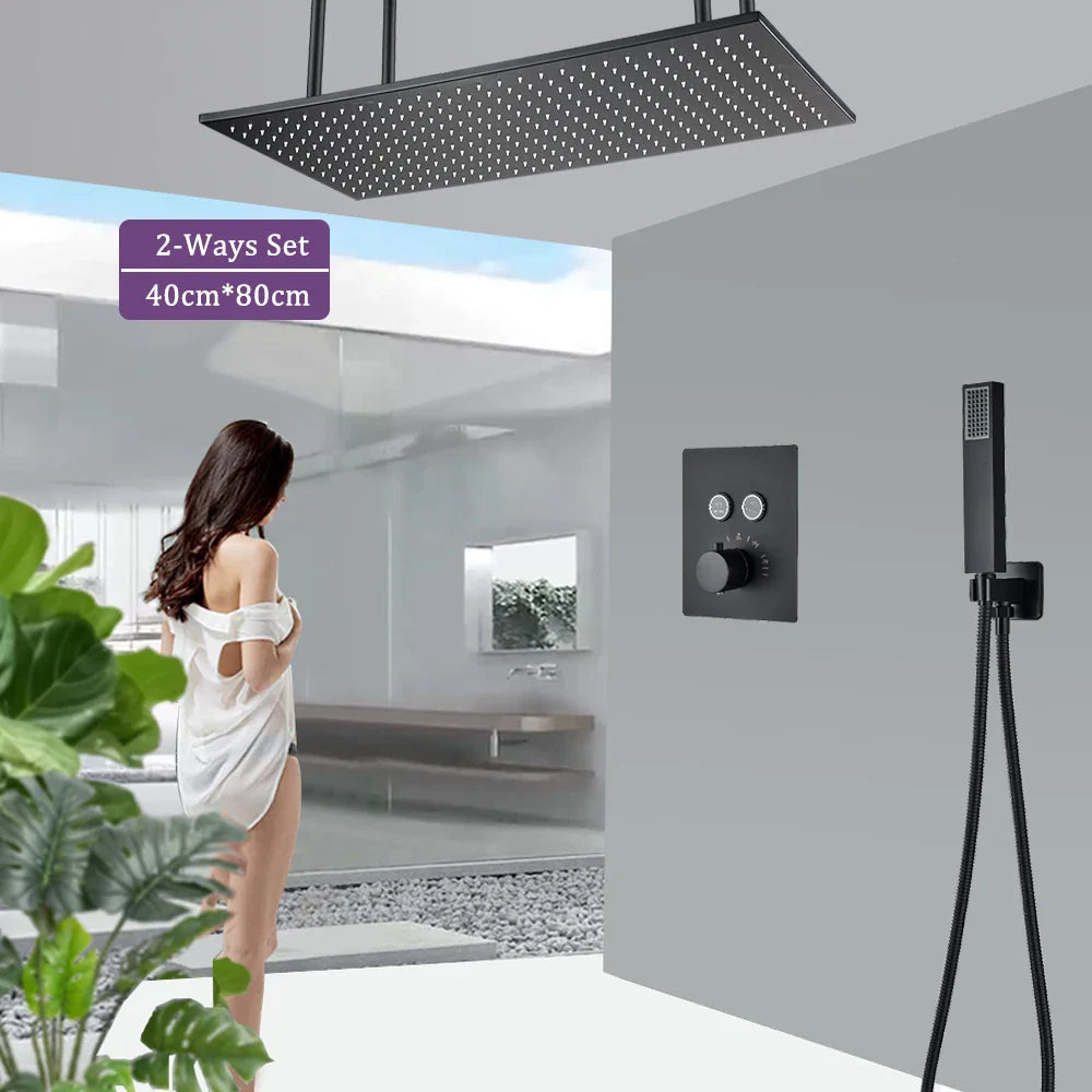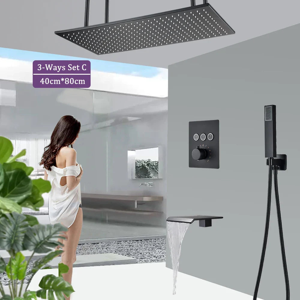 Choose from different sizes of shower heads, ranging from 12'' to 40X80cm, to customize your shower experience. The button control thermostatic mixer valve and concealed install shower design provide a sleek and minimalist aesthetic, perfect for a spa-like retreat in your own home.