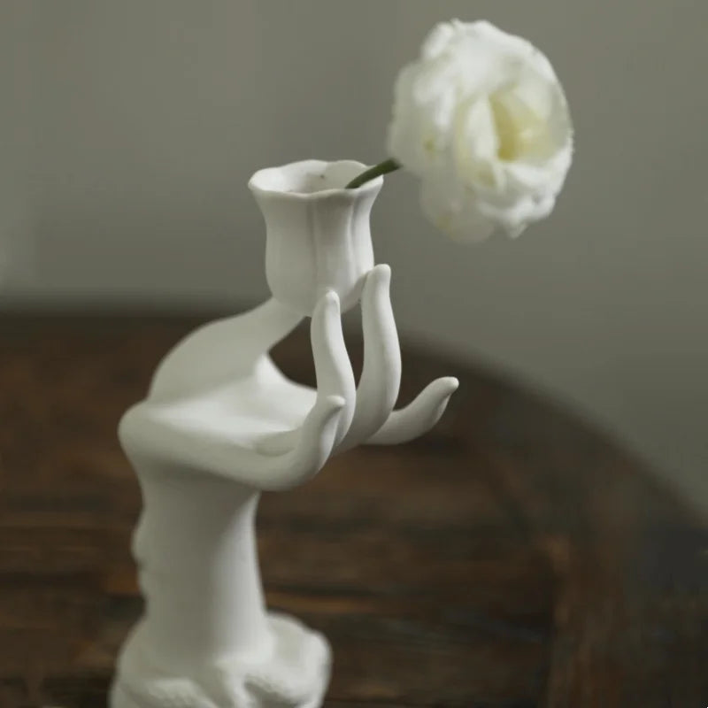 Crafted from high-quality ceramic, these candle holders are designed for use with stick candles, providing a functional and elegant addition to your home decor. The intricate arm lifting flowers hand design adds a unique and eye-catching element to any room.