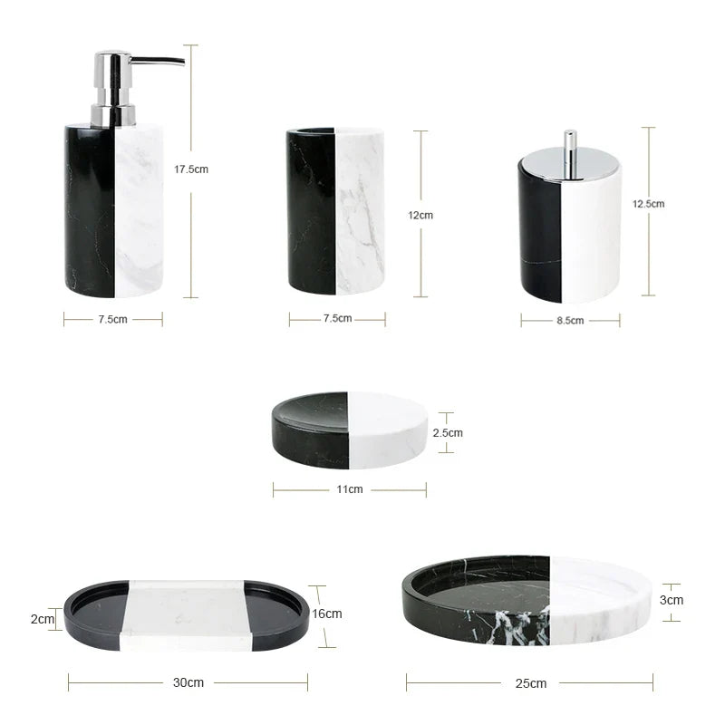 Introducing the Afralia™ Marble Bathroom Set, a luxurious addition to your bathroom decor that exudes elegance and sophistication. This exquisite set includes a soap dispenser, toothbrush holder, soap dish, cotton swab holder, and a tray for all your bathroom essentials.