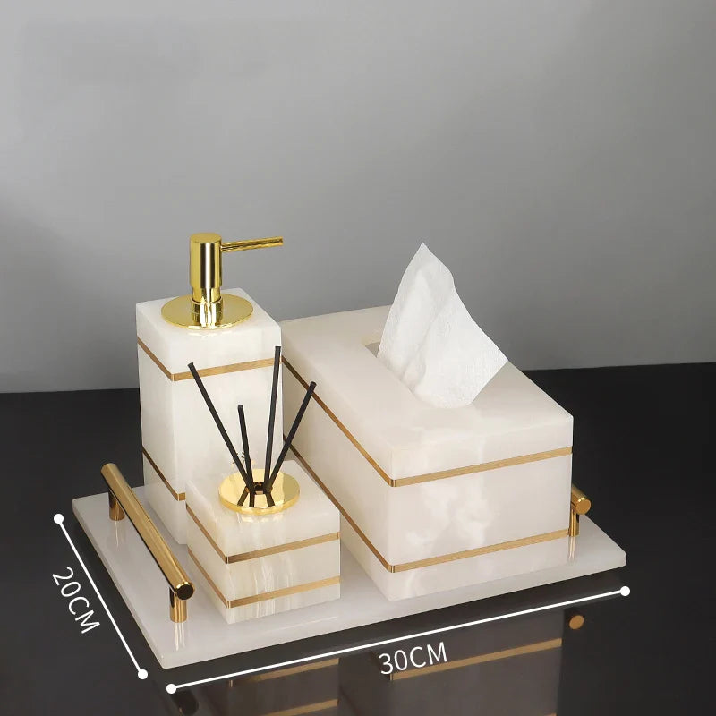 Designed to elevate your bathroom decor, this set is perfect for those who appreciate the finer things in life. Bring a touch of sophistication to your daily routine with the Afralia™ White Onyx Marble Bathroom Set.