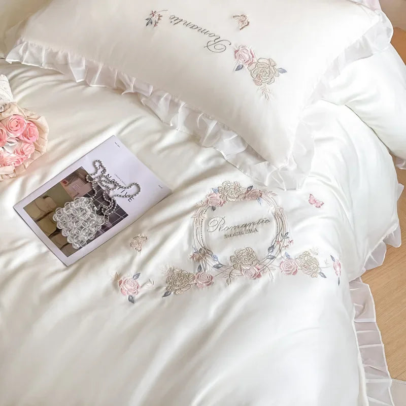 The set includes 4 pieces: a duvet cover, 2 pillowcases, and 1 fitted sheet, all featuring intricate floral embroidery. The thread count meets national standards for color fastness, ensuring long-lasting vibrancy.