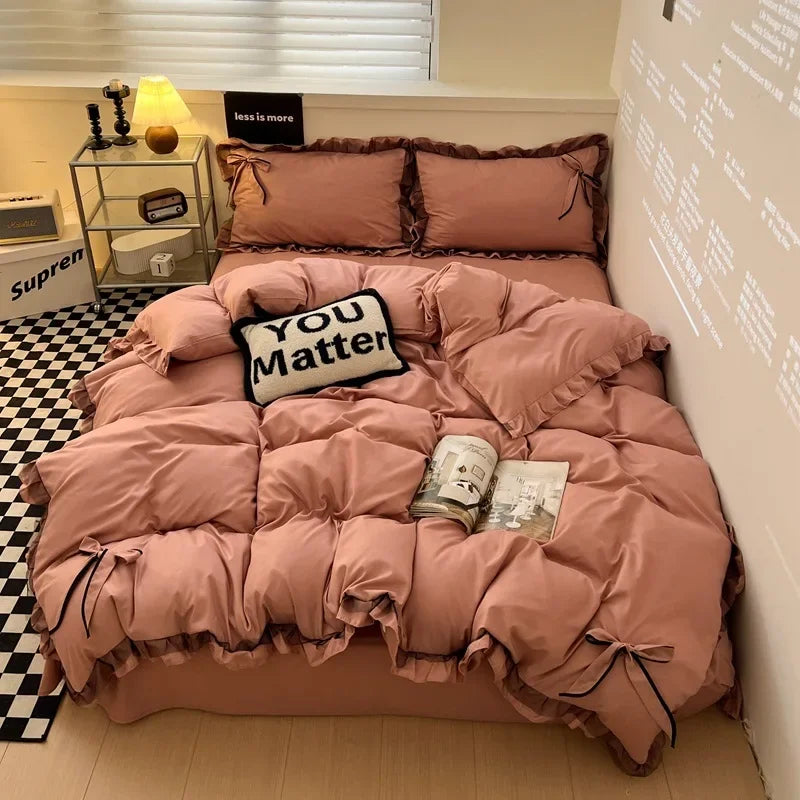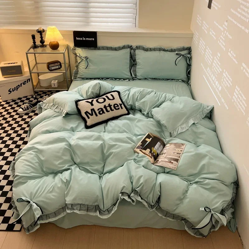 Designed for style and comfort, this bedding set is perfect for those in Northern Europe and beyond. Elevate your bedroom decor with the Afralia™ Princess Bow Embroidery Cotton Bedding Set with Lace and indulge in a restful night's sleep.