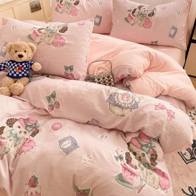Designed with a vibrant print and cartoon pattern, this bedding set adds a touch of style and personality to any bedroom. The set includes a fitted sheet, comforter, and two pillowcases, providing everything you need to complete your bedding ensemble.
