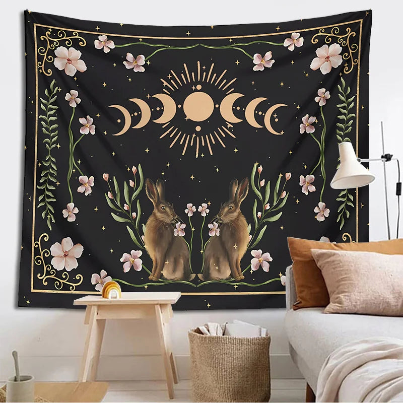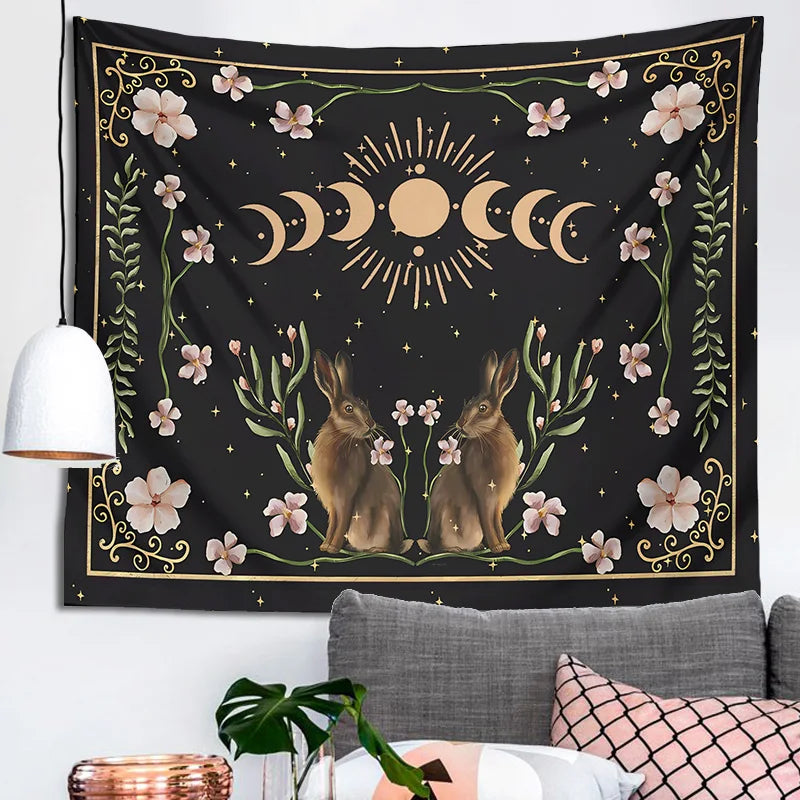 Afralia™ Moon Phase Rabbit Tarot Cloth Celestial Botanical Wall Hanging