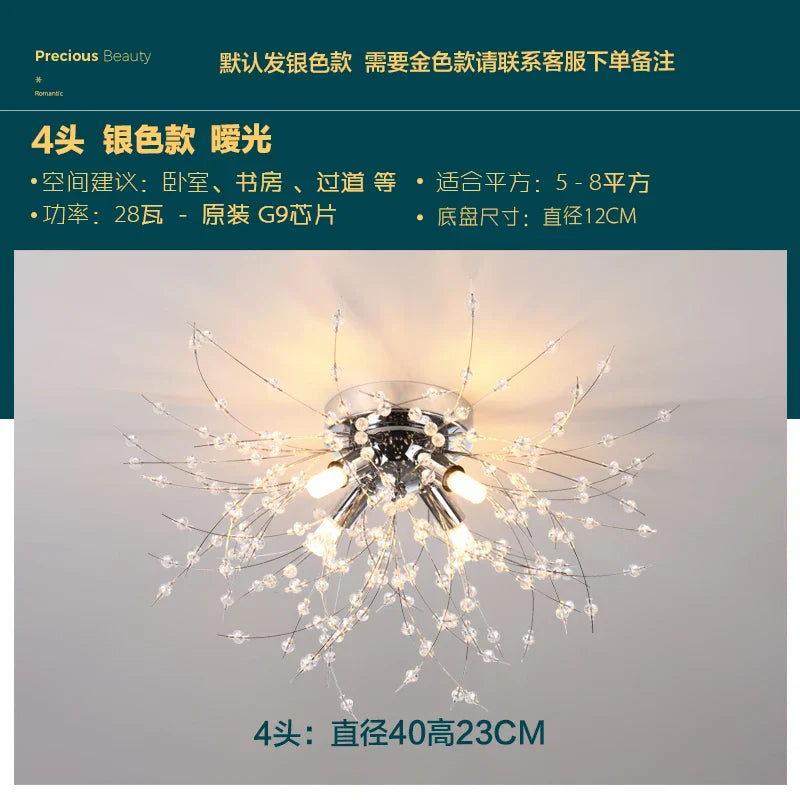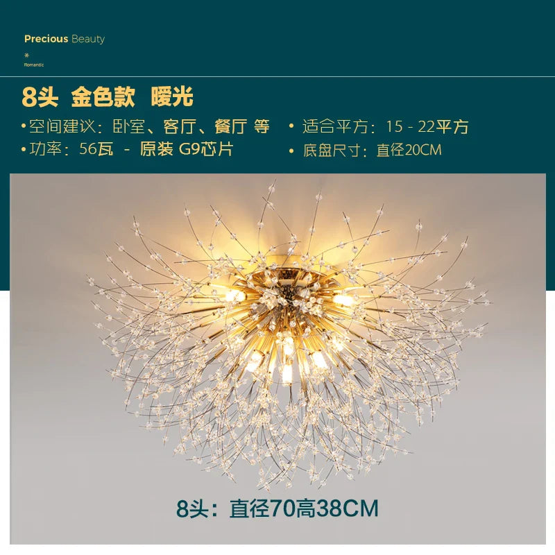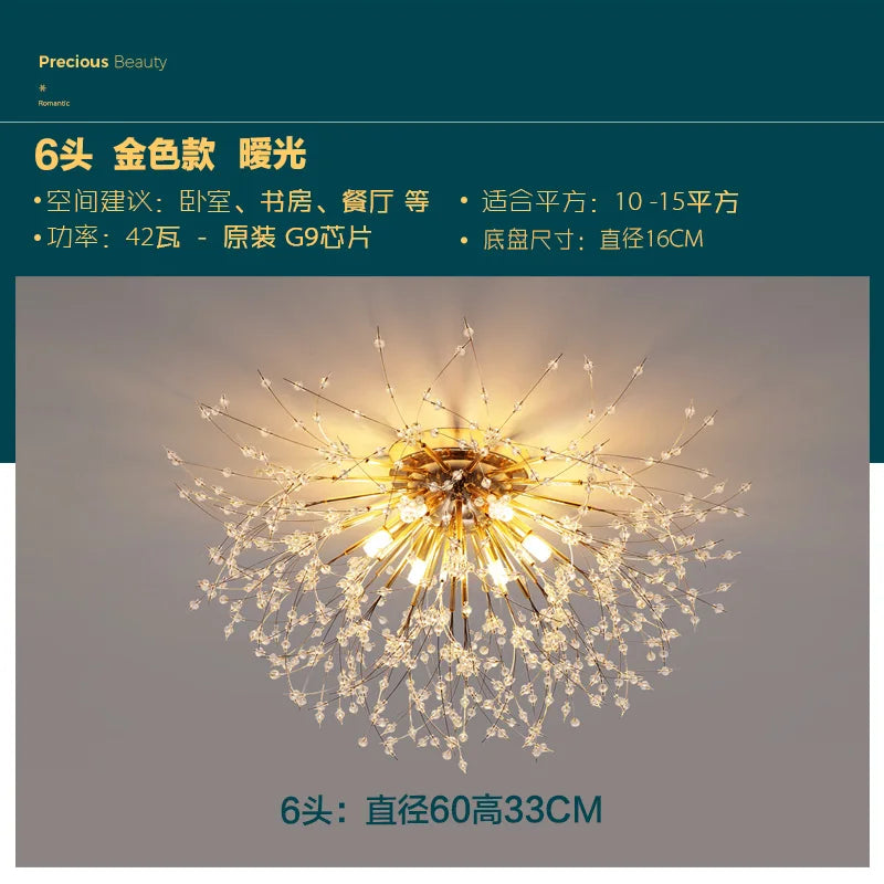 Crafted with care and attention to detail, this ceiling light features a unique dandelion-inspired design that sparkles with elegance. The golden crystals refract the LED light, creating a warm and inviting glow that illuminates the room beautifully.