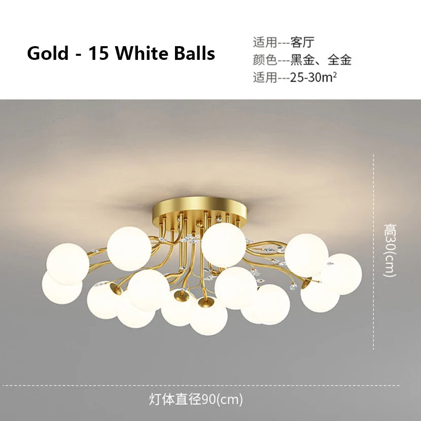Illuminate your surroundings with the warm glow of LED bulbs nestled within a cluster of exquisite glass ball shades. The polished chrome finish adds a touch of sophistication to the iron body, while the plated technics ensure lasting durability. With 10-15 light sources, this ceiling light is designed to light up a generous 15-30 square meters of space, making it perfect for daily lighting needs.