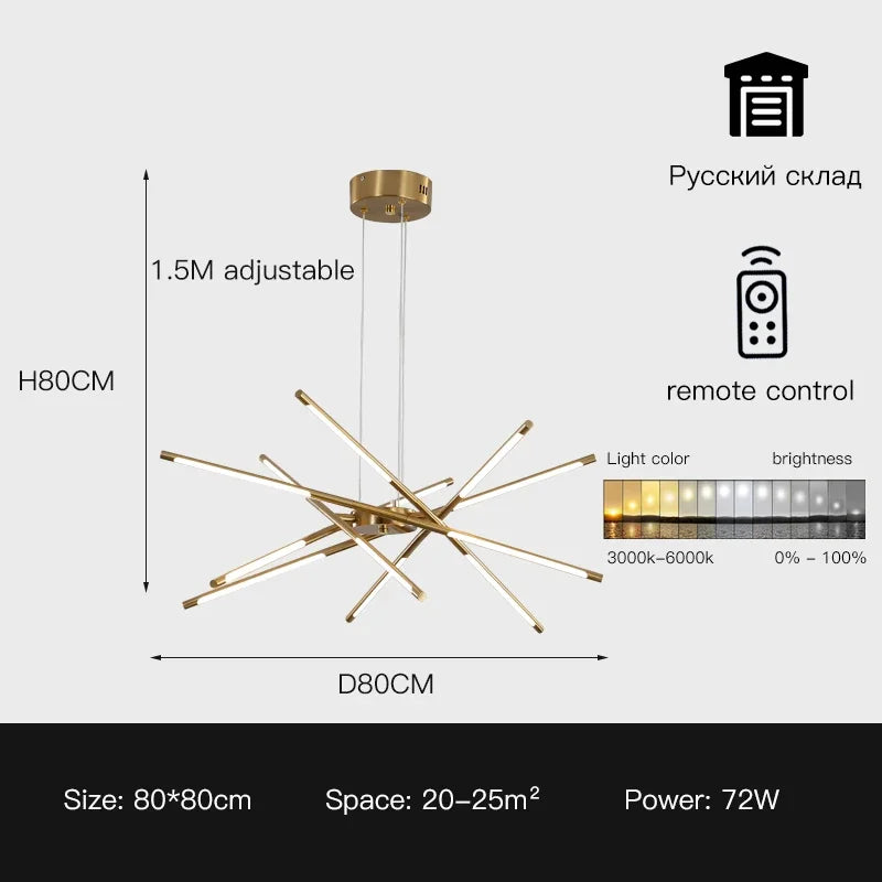 Crafted with high-quality materials, this chandelier features a sleek aluminum body with a shadeless design in a beautiful iron finish. The black gold color adds a touch of sophistication, while the LED bulbs provide a warm and inviting glow. The shade direction is downwards, creating a captivating play of light and shadow in the room.