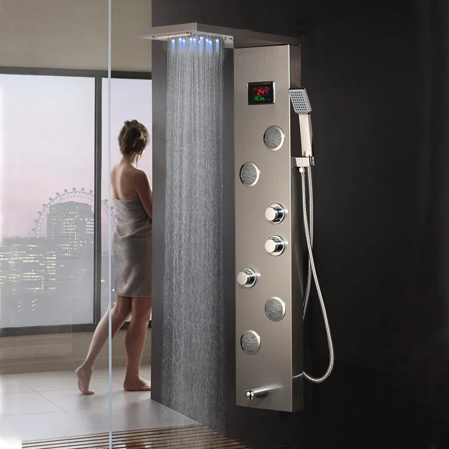 Elevate your shower experience with the Afralia™ Brushed Nickel Shower Panel with LED Display. This contemporary shower panel boasts a sleek brushed nickel finish that adds a touch of elegance to any bathroom decor.