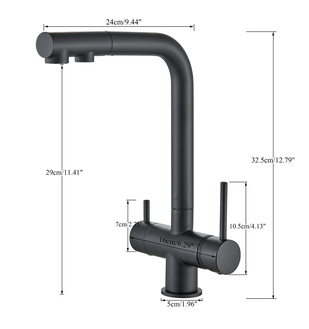With features like cold and hot water options, filtered water spout, and a pull-out dual sprayer, this faucet offers convenience at your fingertips. The dual-handle design allows for easy temperature and flow control, while the ceramic valve core ensures smooth and drip-free operation.