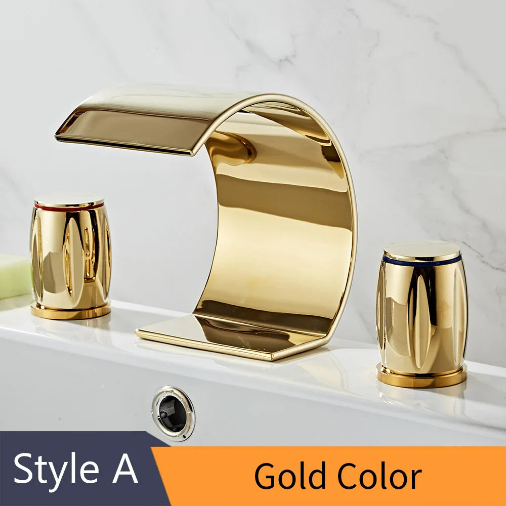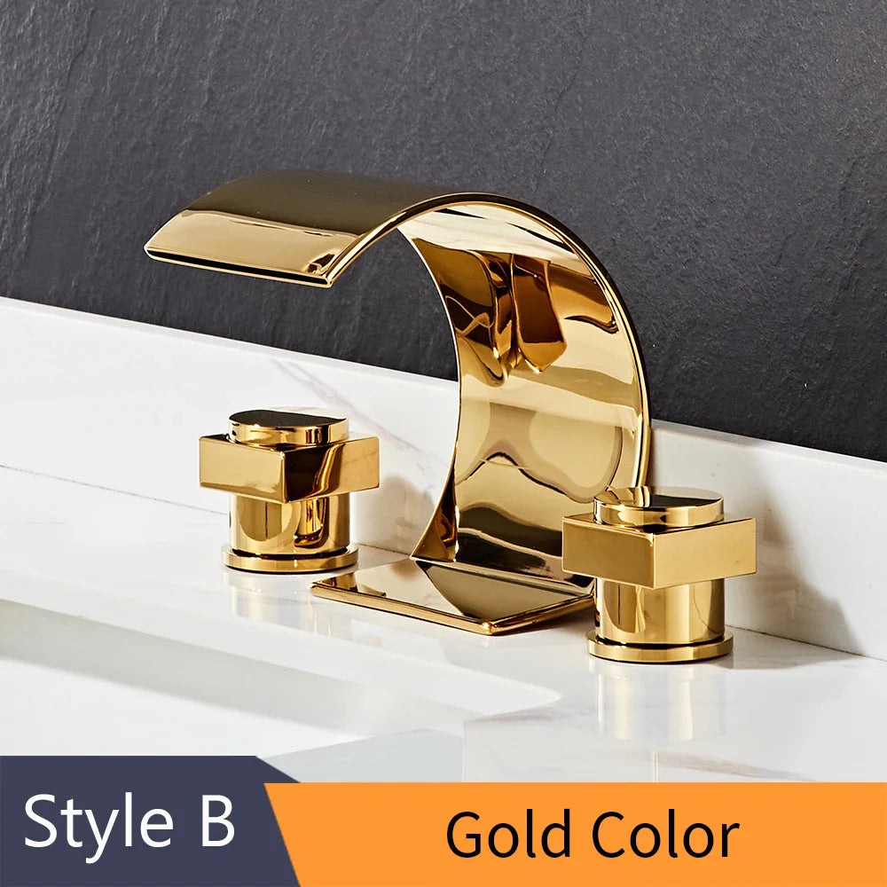 Enhance your bathroom ambiance with the Afralia™ Gold Double Handle Basin Faucet - Three Hole Bathroom Sink Mixer. Elevate your space with this exquisite piece that combines style, functionality, and quality seamlessly. Make a statement with every detail - from the sleek design to the flawless operation, this basin faucet is truly a standout choice for your bathroom.