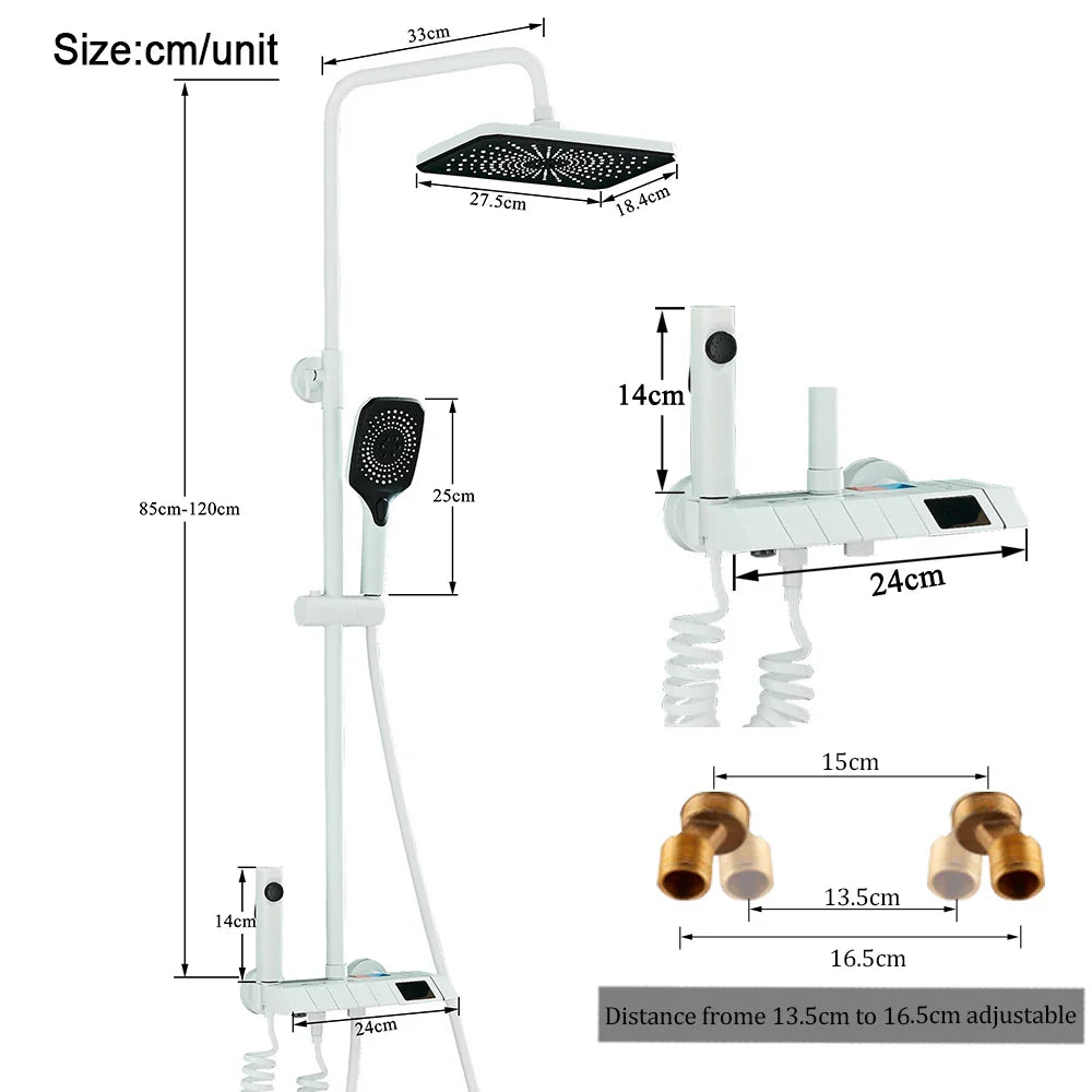 Introducing the Afralia™ Black Piano Digital Shower System with Intelligent Brass Faucets and White Rainfall Shower. This contemporary shower system is designed with innovative features to elevate your shower experience.