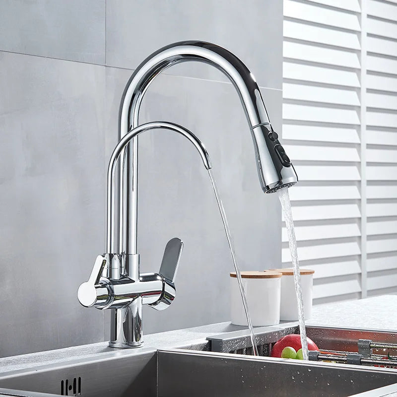 Experience the perfect blend of hot and cold water with the Afralia™ Dual Handle Water Filter Faucet. The sleek chrome finish adds a touch of elegance to any kitchen decor, while the dual handle design allows for easy temperature control. The spout is specially designed for filtered water, providing you with clean and fresh drinking water straight from the tap.