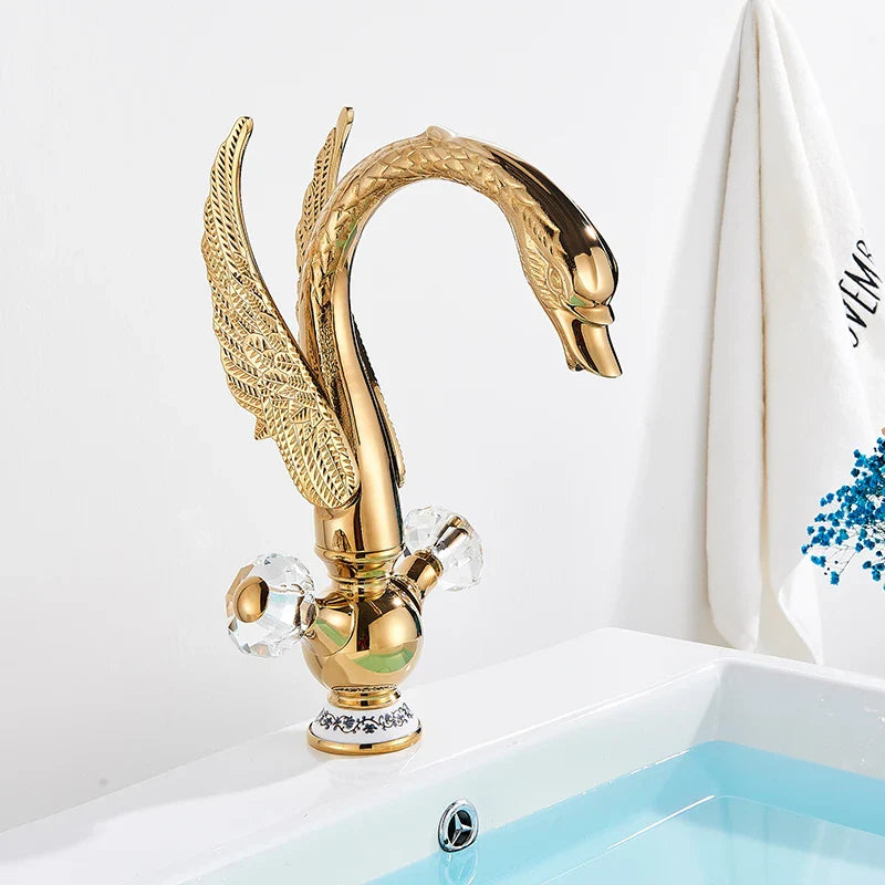 Introducing the Afralia™ Golden Swan Basin Faucet, a perfect blend of elegance and functionality for your bathroom space. Crafted with high-quality solid brass, this deck-mounted dual handle mixer tap exudes luxury and sophistication.