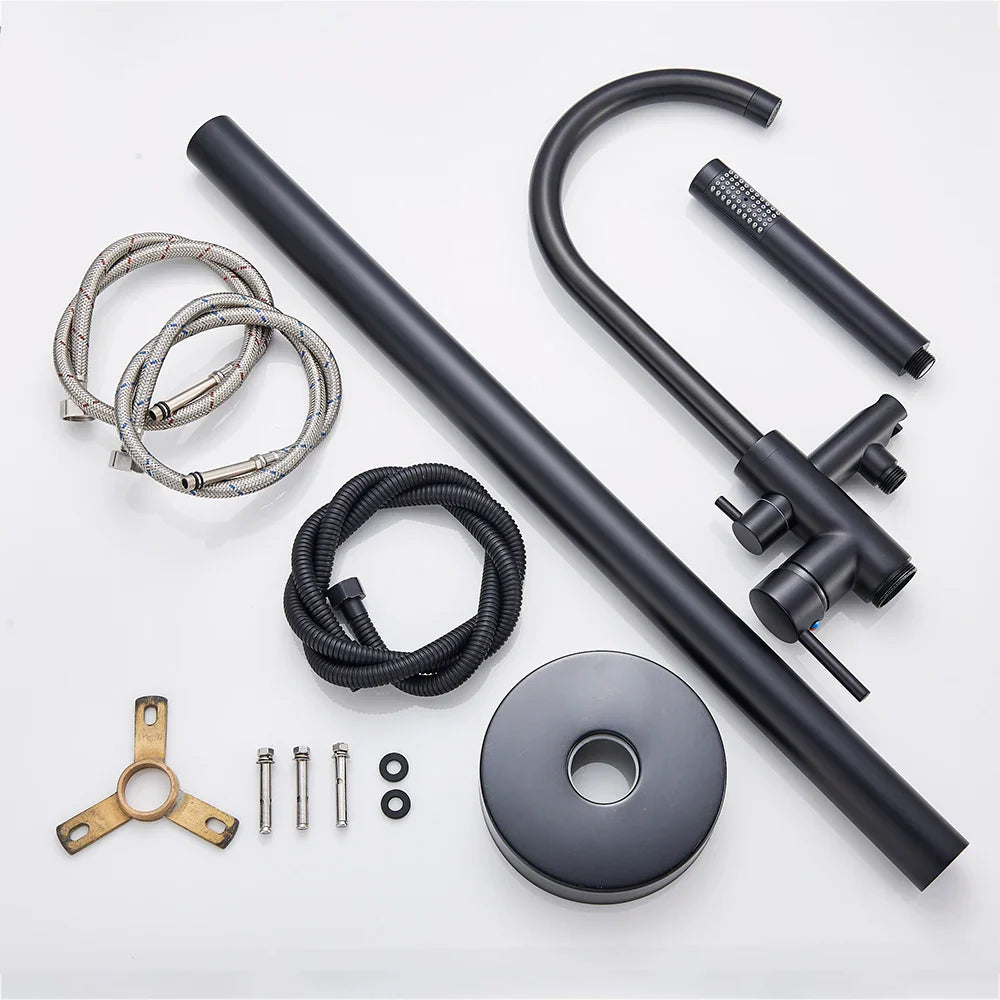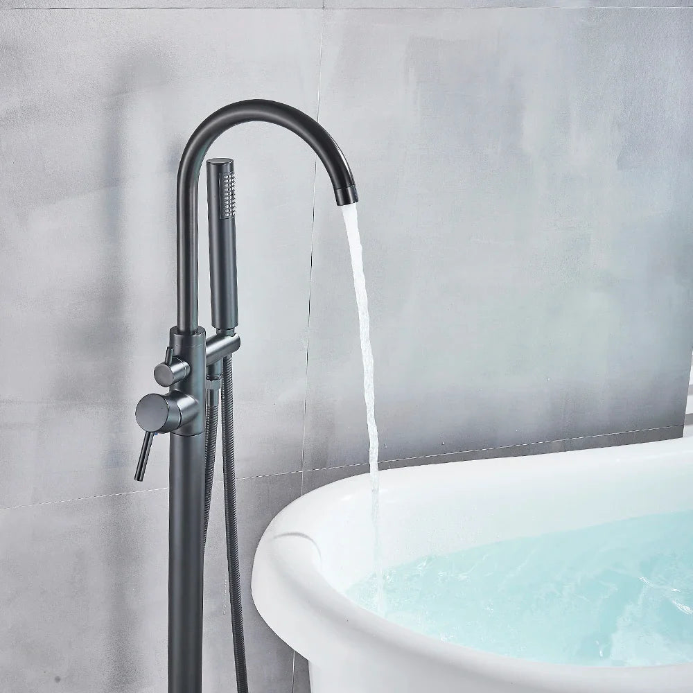 Elevate your bathing experience with the Afralia™ Black Dual Handle Freestanding Bathtub Faucet Set Floor Standing Bath Mixer Tap. This exquisite faucet set combines modern design with functional excellence to bring luxury to your bathroom.