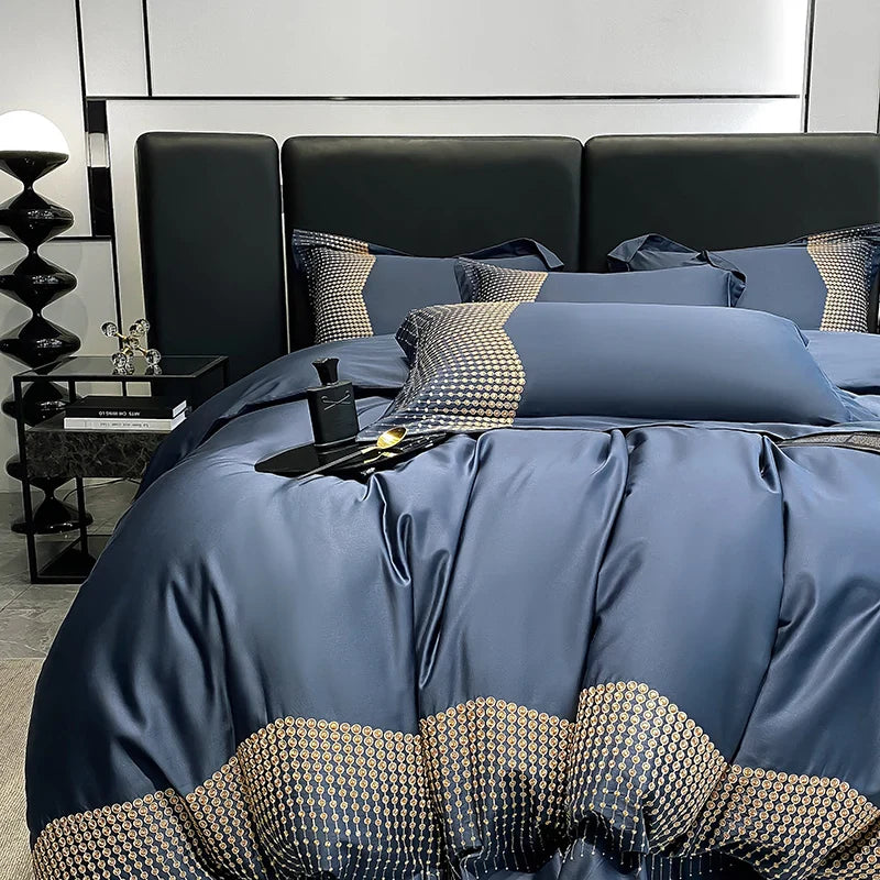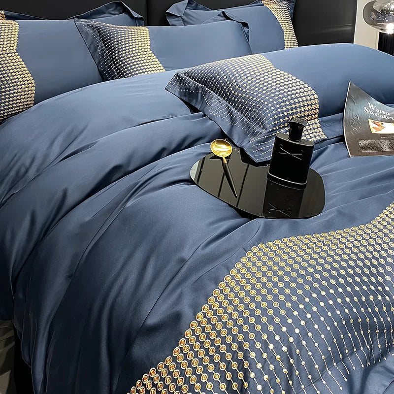 Upgrade your bedroom with the Afralia™ 1000TC Cotton Embroidery Luxury Bedding Set in Blue, White, and Champagne. This exquisite bedding set is designed to bring comfort and style to your sleeping space.