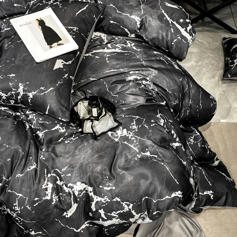 Afralia™ Black Grey Marble Ice Silk Duvet Cover Set - Luxury Cooling Comfort, Nordic Style