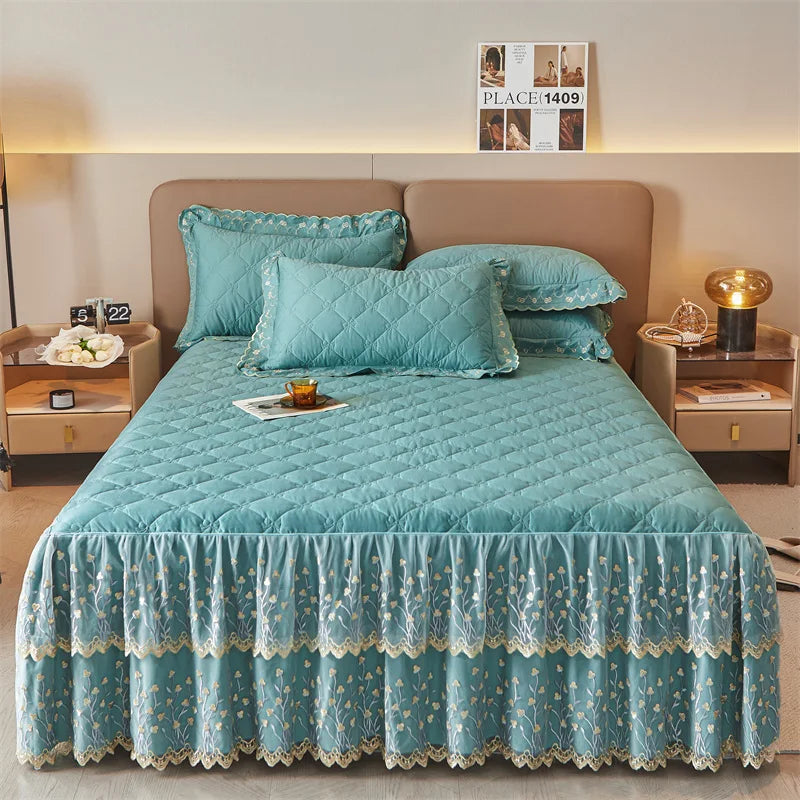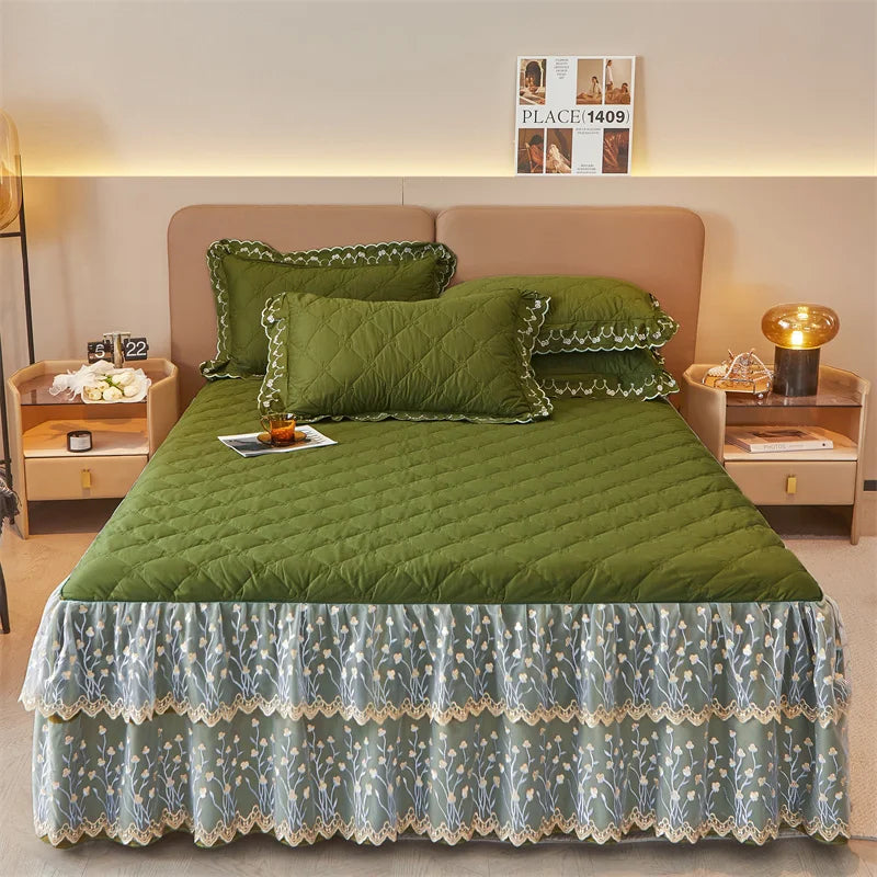 Elevate your bedroom decor with our Afralia™ Cotton Lace Ruffles Quilted Bed Skirt Set with Pillowcases. Experience luxury and style like never before with this exquisite bedding collection.