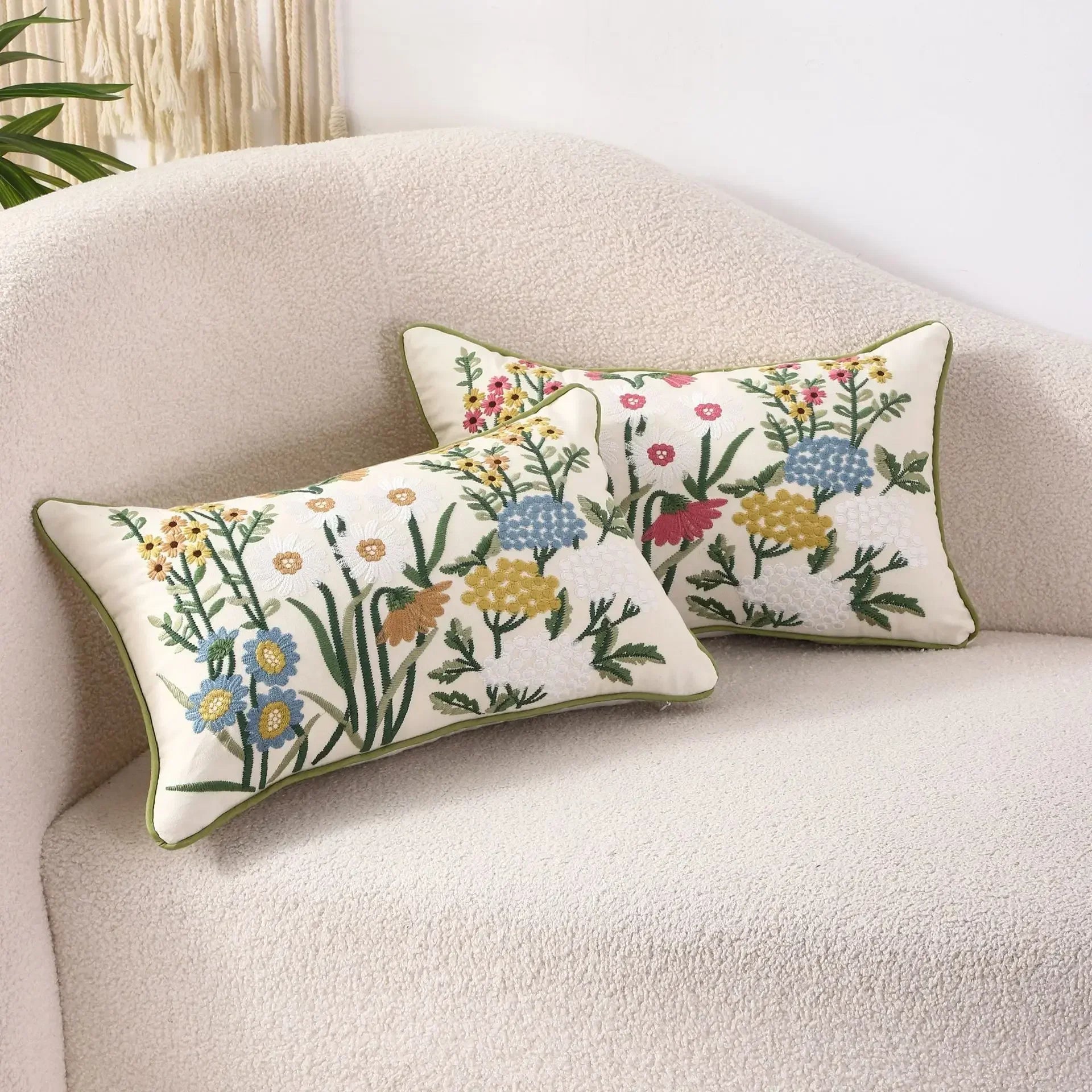 Afralia™ Floral Embroidered Cushion Cover 28x48cm Farmhouse Yellow Pink Flower Pillowcase Cotton