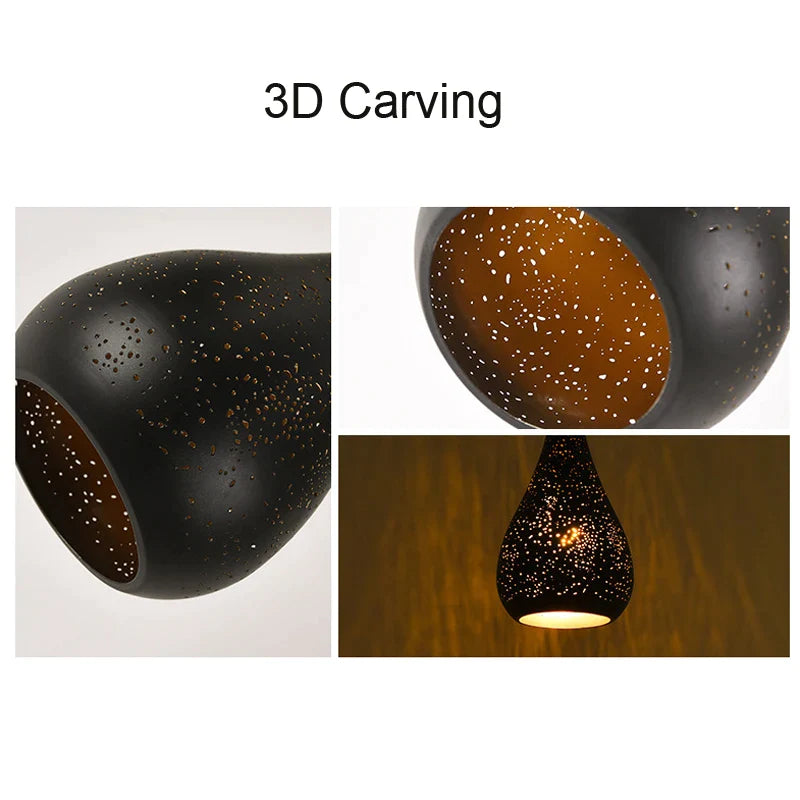 Crafted from high-quality metal with a sleek black lampshade, this pendant light features a unique through-carved technic that sets it apart from the rest. The iron finish adds a touch of industrial charm, making it a versatile addition to any decor style.