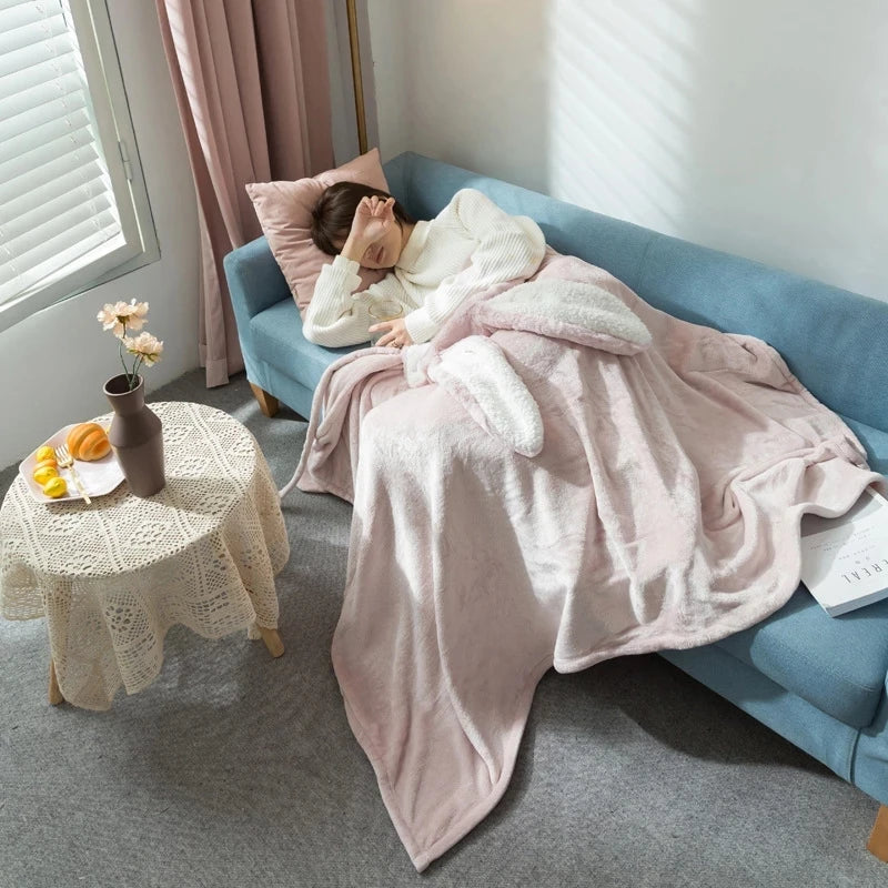 Indulge in the luxurious comfort of the Afralia™ Kawaii Rabbit Hooded Blanket, a cozy addition to your home decor. Crafted from premium Polyester and Cotton blend, this Coral Velvet Warm Throw Blanket is designed to keep you warm and stylish during the winter season.