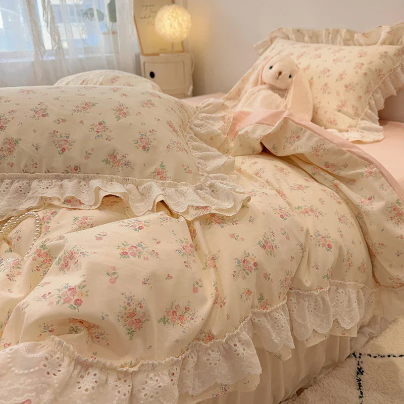 Afralia™ Korean Princess Style Floral Lace Ruffles Bedding Set with Pillowcase