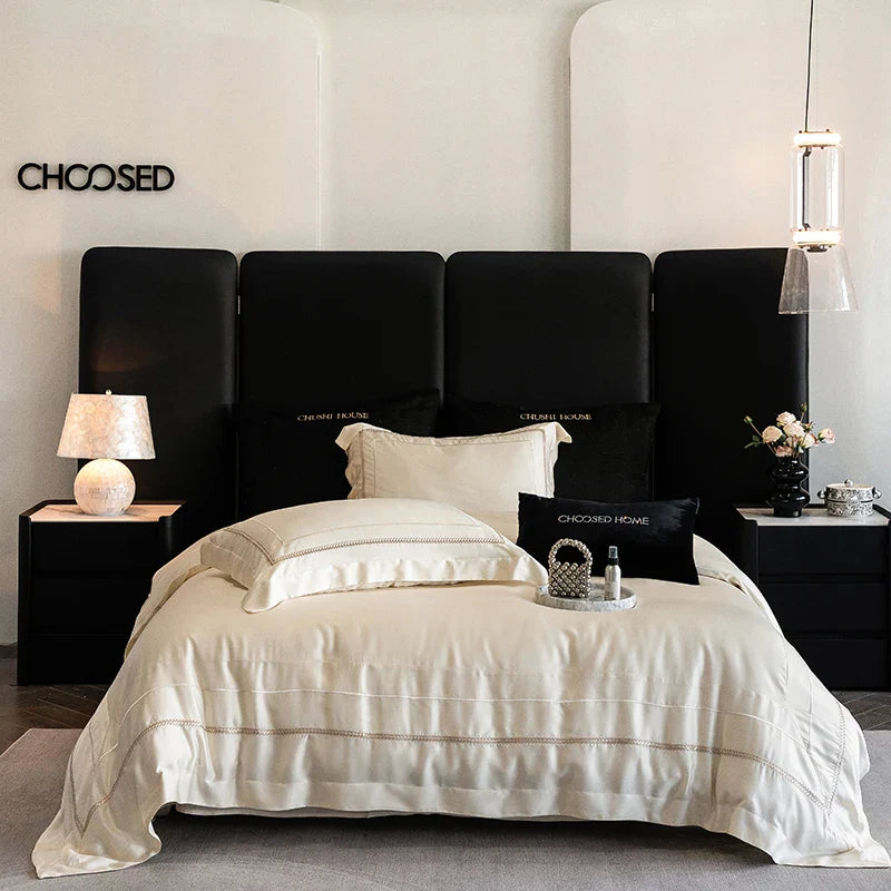 The embroidery details add a touch of elegance, showcasing the meticulous process technique and craftsmanship involved in creating this masterpiece. The simple yet sophisticated design effortlessly complements any bedroom decor, adding a touch of sophistication to your space.