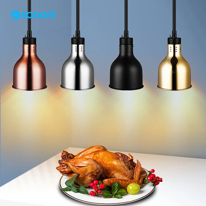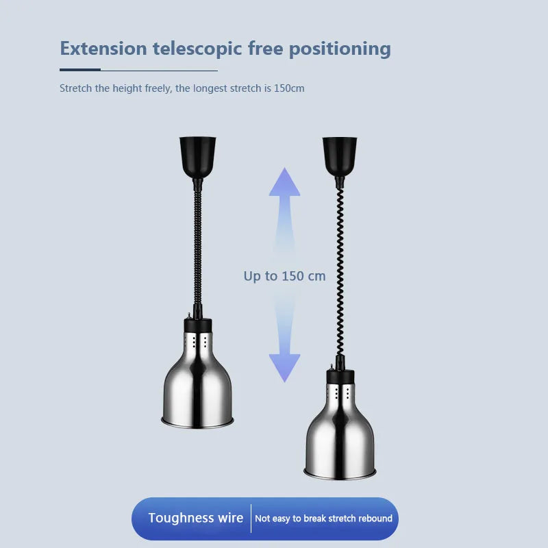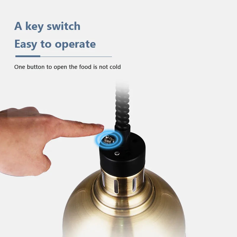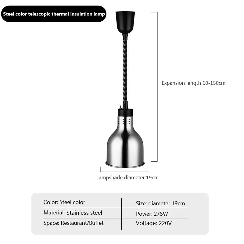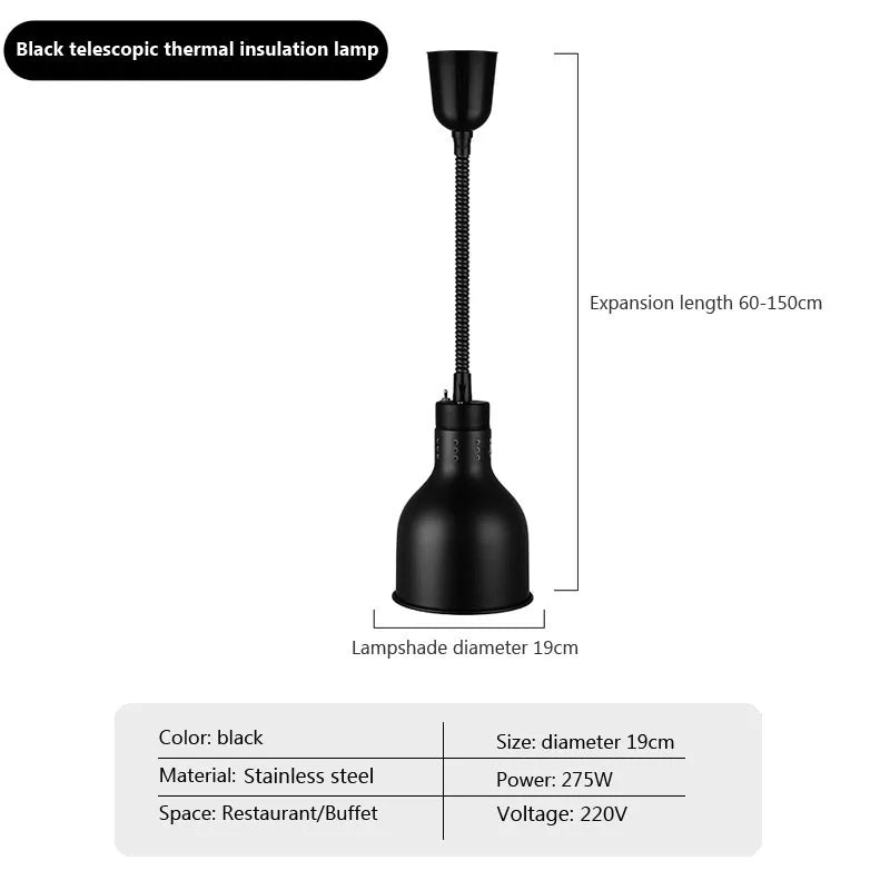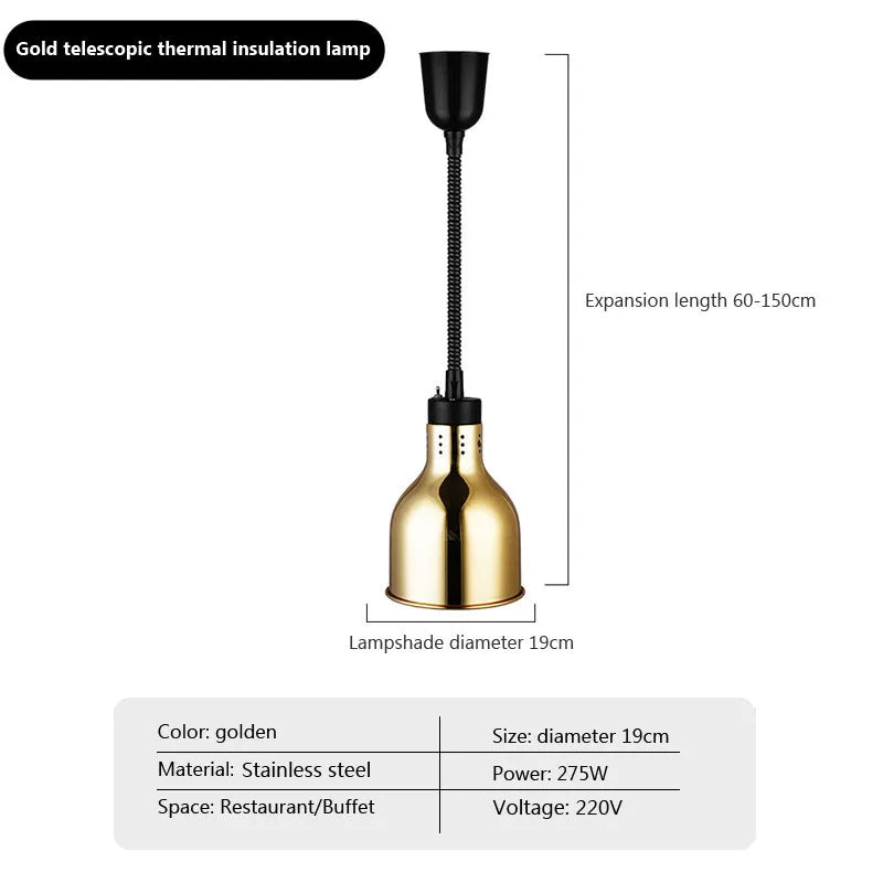 Featuring a unique design, this pendant lamp combines industrial aesthetics with practicality, making it ideal for buffet setups, hotels, and restaurants. The inclusion of LED bulbs ensures efficient and energy-saving illumination, while the heat lamps function provides food insulation for maintaining optimal serving temperatures.