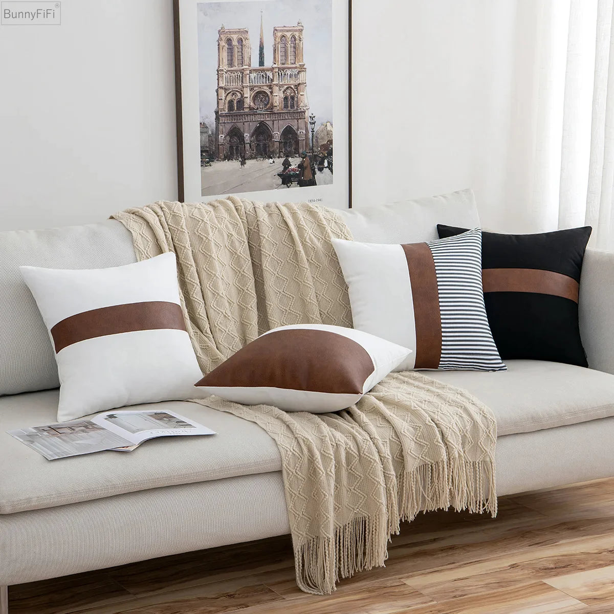 Introducing our Afralia™ Modern Leather Cotton Cushion Cover in a sophisticated brown, white, and black palette. Elevate your home decor with this stylish cushion cover that exudes elegance and luxury.
