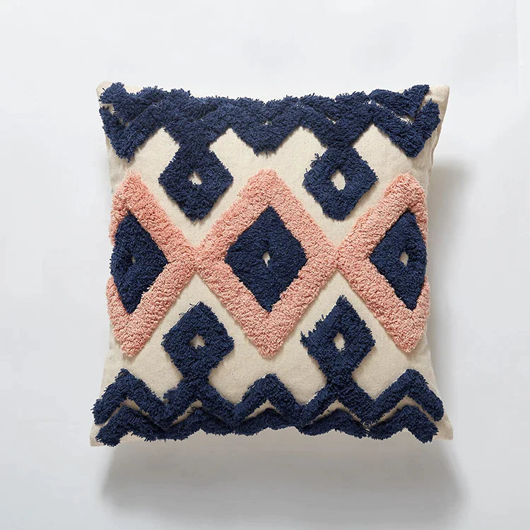 Indulge in the luxurious charm of handcrafted elegance with our Afralia™ Moroccan Tufted Cushion Cover. Made with meticulous attention to detail, this stunning piece features a vibrant combination of teal, pink, navy, grey, and ivory in a captivating diamond stripe design.