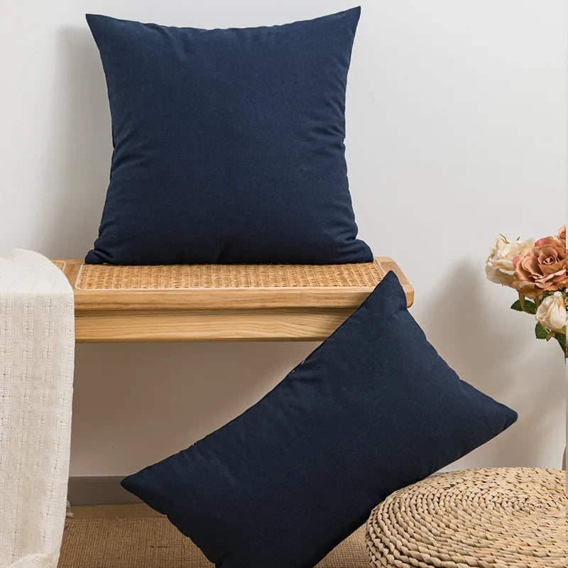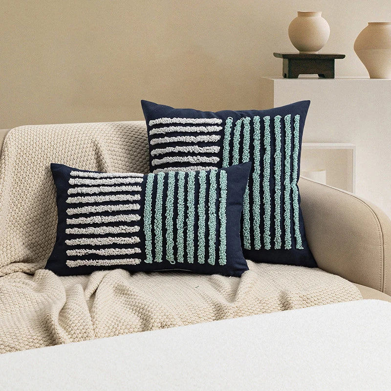 Afralia™ Navy Blue Yellow Stripe Embroidered Cotton Canvas Tufted Cushion Cover