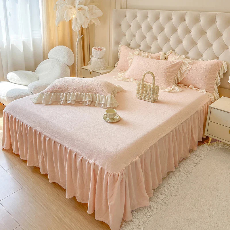 Afralia™ Pink Velvet Princess Bedding Set with Lace Ruffles and Bow Accents