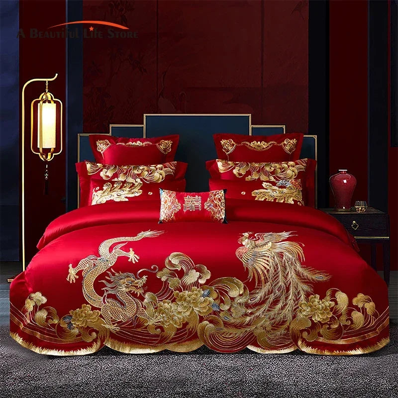Introducing the Afralia™ Red Chinese Wedding Style Bedding Set with Gold Loong Phoenix Embroidery - a true masterpiece in home decor!