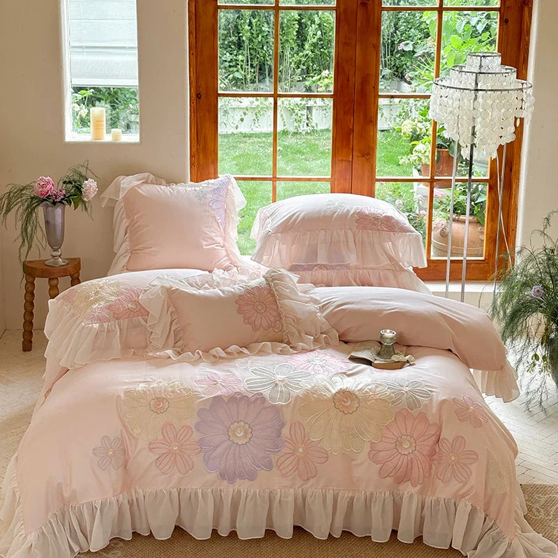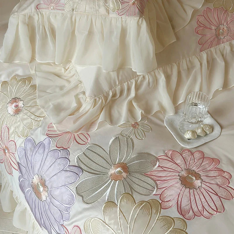 Enhance your bedroom with the Afralia™ Romantic Flowers Lace Ruffles Princess Bedding Set, crafted with high-quality 1200TC Egyptian Cotton for a luxurious feel. This exquisite set includes a Duvet Cover, Bed Sheet, and Pillowcases embroidered with delicate floral details.