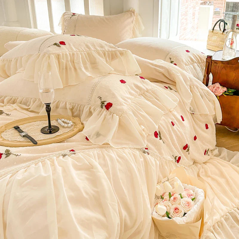 Indulge in the luxurious elegance of our Afralia™ Romantic Lace Ruffles Rose Flowers Embroidery Princess Bedding Set. Crafted with meticulous attention to detail, this exquisite bedding set exudes charm and sophistication, perfect for creating a dreamy bedroom retreat.