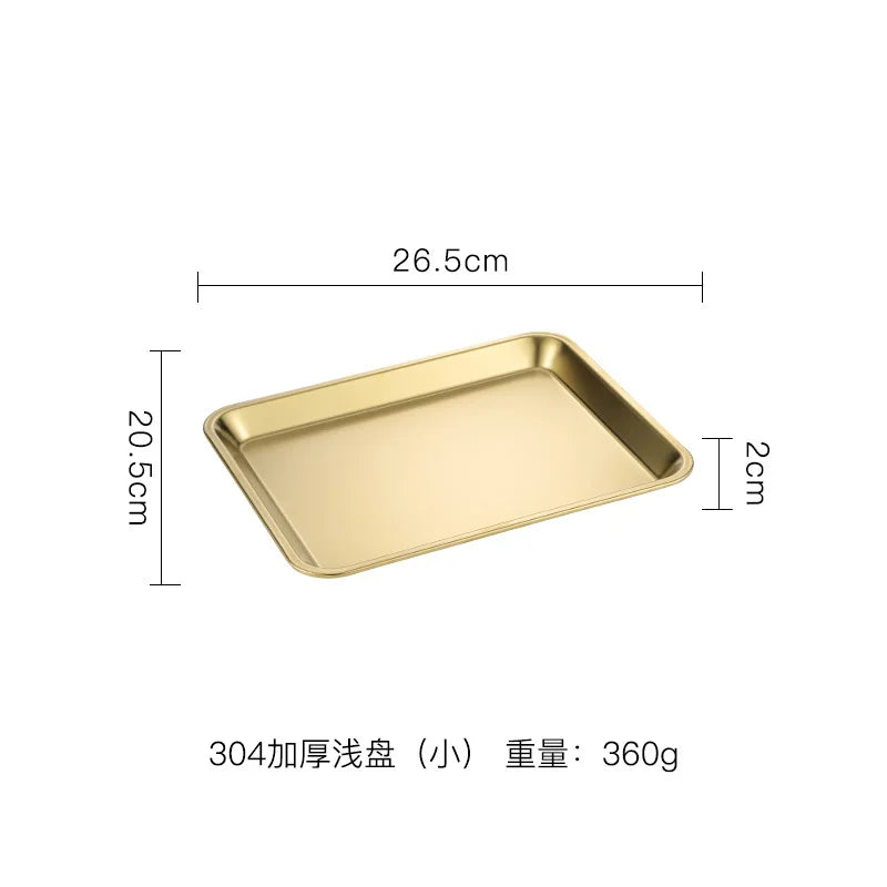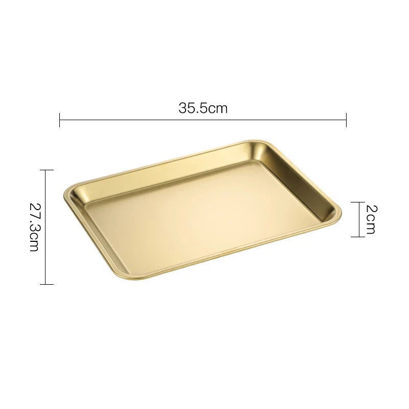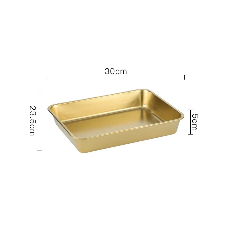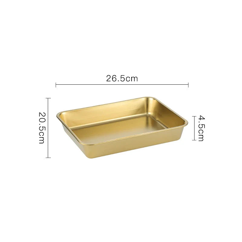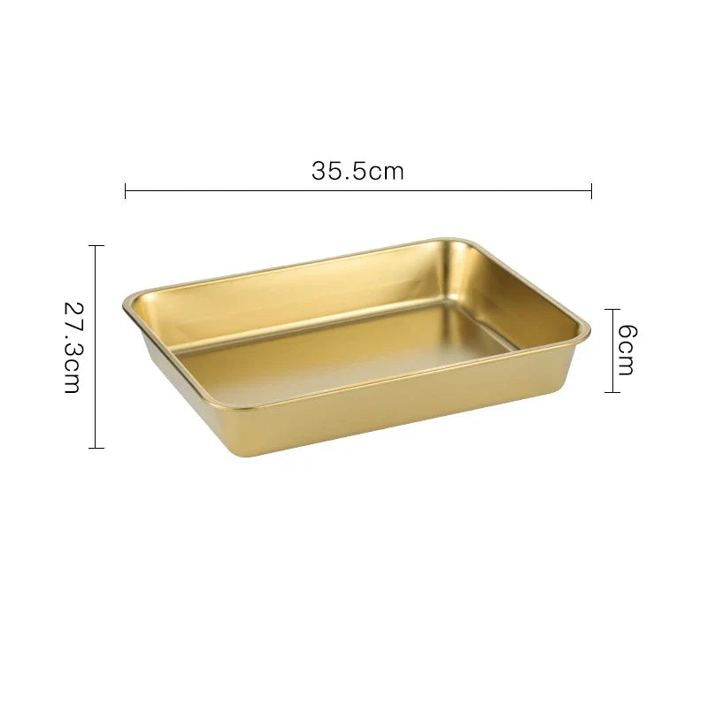 Available in classic gold and silver colors, the Afralia™ Stainless Steel Rectangle Food Tray comes in a variety of sizes to suit your needs: 26.5x20.5x2cm, 30x23.5x2cm, 35.5x27.3x2cm, 26.5x20.5x4.5cm, 30x23.5x5cm, and 35.5x27.3x6cm.