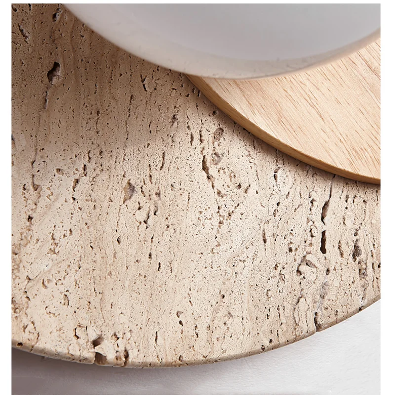 Crafted with high-quality materials, this wall lamp features a unique design with a base made of stone and a canopy of yellow travertine. The lampshade is constructed with frosted glass, adding a touch of sophistication to any space.