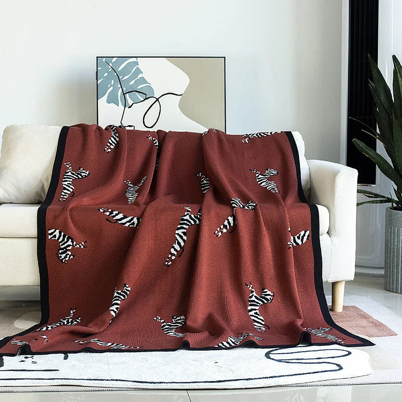 The Afralia™ Zebra Jacquard Knit Throw Blanket features a unique thread/towel blanket design in a classic rectangular shape, making it perfect for picnics, travel, military use, hospitals, hotels, airplanes, or simply for cozying up at home.