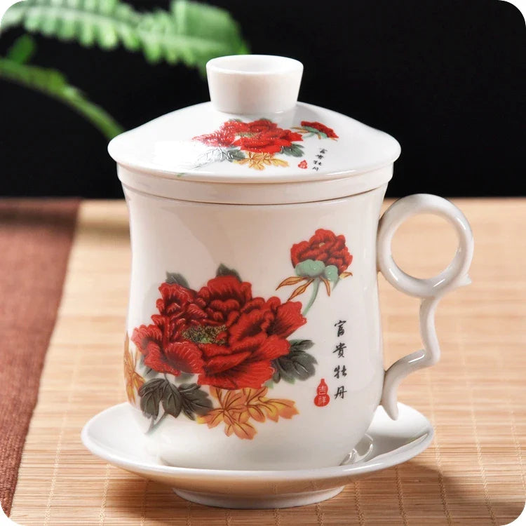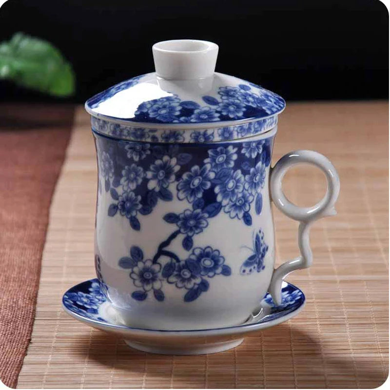 Afralia™ Blue and White Porcelain Tea Cup with Lid and Filter