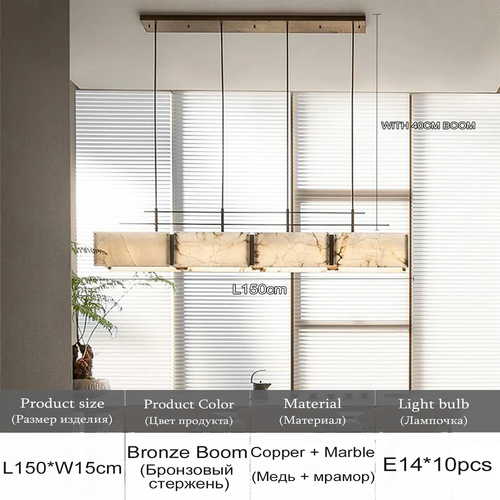 Elevate your space with our Luxurious Long Marble Chandelier Pendant Light, crafted with a modern minimalist touch of Copper and Bronze accents. This exquisite hanging lamp is designed to illuminate your Dining Room or Kitchen Table with unparalleled elegance.