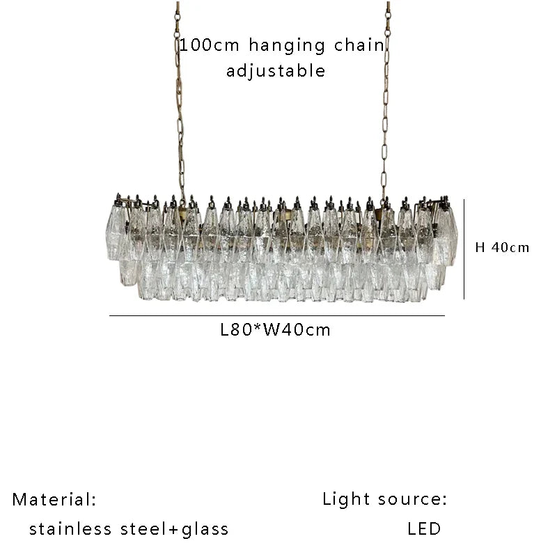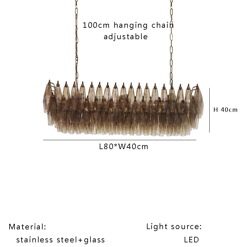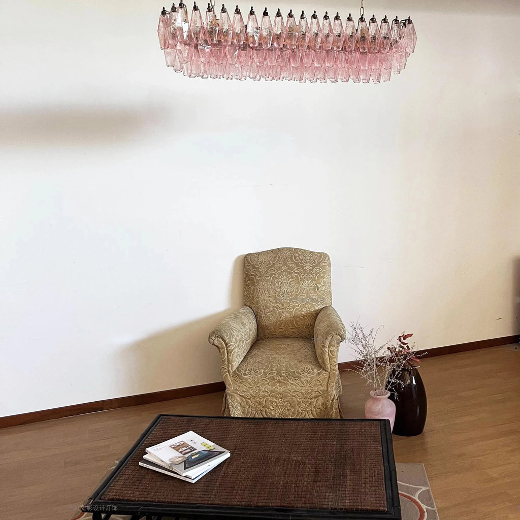 Introducing our stunning Modern American Led Rhombic Gray Pink Clear Glass Chandelier Lighting, perfect for adding a touch of elegance to your dining room or indoor home decor.