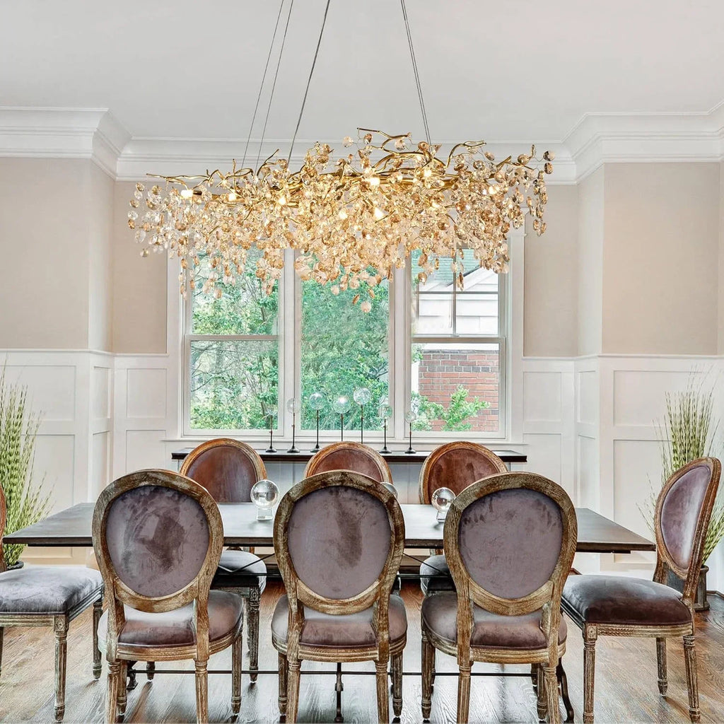 Indulge in the timeless elegance of our Round Gold Crystal Chandelier, designed to elevate the ambiance of your bedroom, living room, or dining room. This modern luxury chandelier features delicate gold branches adorned with shimmering crystals, creating a captivating focal point in any space.