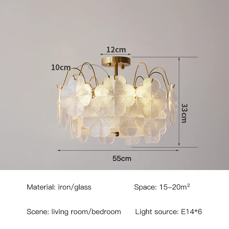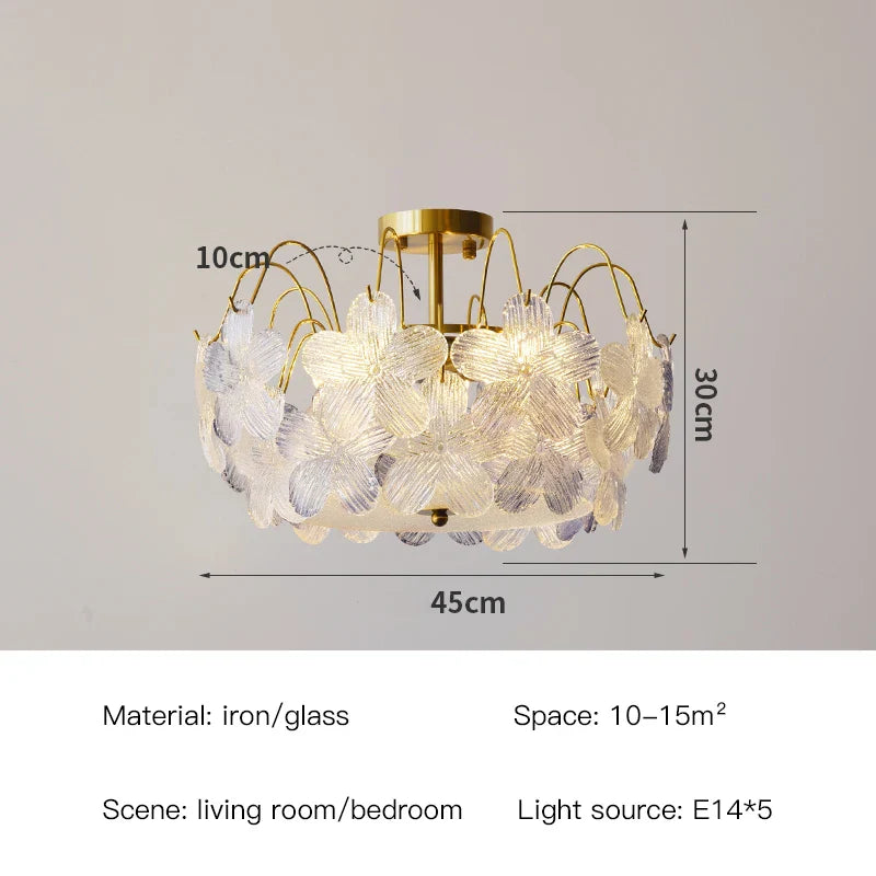 Elevate your space with the captivating charm and timeless beauty of our Modern French Style Flower Lamp Glass Chandelier. This exquisite piece is designed to illuminate and enhance any room with its LED bulbs, creating a warm and inviting atmosphere. The crystal material exudes luxury and elegance, while the gold finish adds a touch of sophistication.